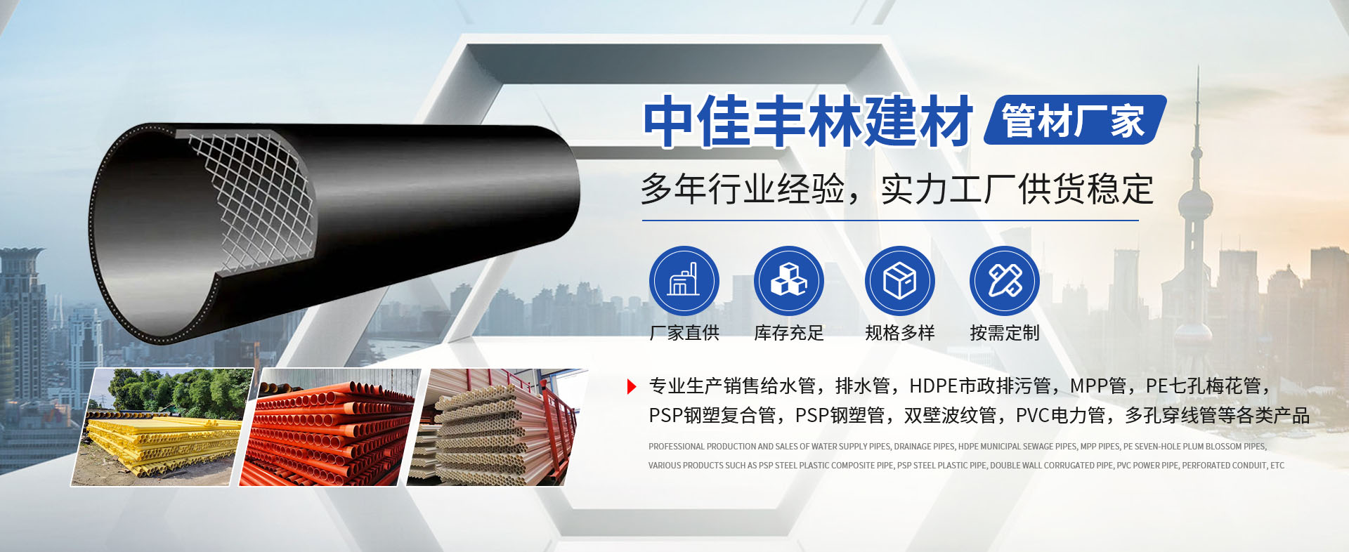 四川中佳豐林建材有限公司是集市政管材設計、生產、銷售安裝于一體的實力廠家,專業生產銷售給水管,排水管,HDPE市政排污管,MPP管,PE七孔梅花管,PSP鋼塑復合管,PSP鋼塑管,雙壁波紋管,PVC電力管,多孔穿線...